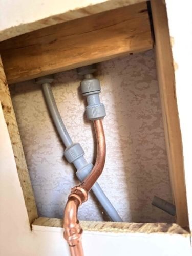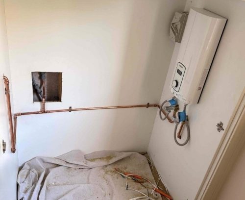 New copper pipework was routed neatly within the cabinetry, and an access point was created through the external wall for the cold-water feed. With precision and care, the new instantaneous unit was mounted securely, connected to both the cold mains and the hot outlet, and all access points were patched for a clean, professional finish.