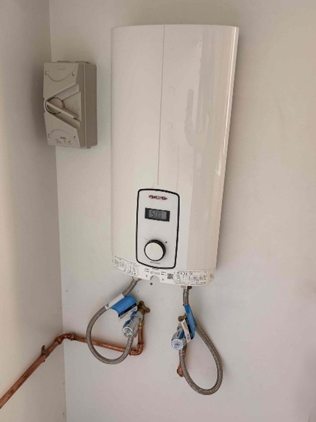 New copper pipework was routed neatly within the cabinetry, and an access point was created through the external wall for the cold-water feed. With precision and care, the new instantaneous unit was mounted securely, connected to both the cold mains and the hot outlet, and all access points were patched for a clean, professional finish.