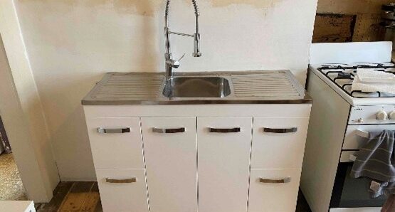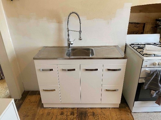 - Cabinet preparation: Holes were drilled precisely to accommodate the existing water points and waste, ensuring a clean and functional layout. New timbers were installed for proper cabinet support, preventing future movement that could cause leaks.