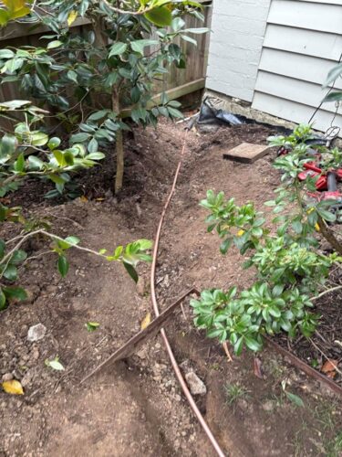 A new trench was dug from the meter to the rear of the garage and extended under the house. Great care was taken around footpaths, trees, and other property features, demonstrating O’Shea’s commitment to both professional workmanship and respect for the homeowner’s property.