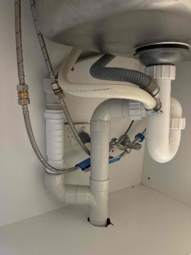 Our expert team got to work immediately. We removed all the old waste piping, cut down the 50-millimetre pipe, and installed a new junction facing the right side of the cabinet to improve accessibility. We then reduced it to 40 millimetres and fitted a HepvO waterless trap for the dryer drain line, a modern solution that prevents odours and blockages. To complete the setup, we added a new 50-millimetre P-trap and neatly connected the overflow and washing machine hoses into the system.