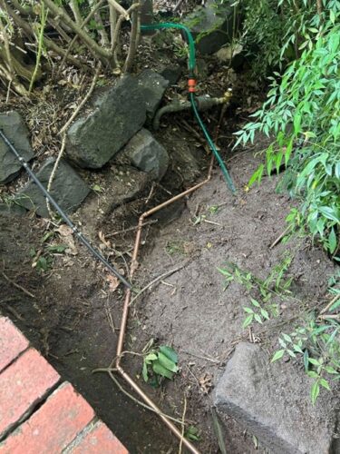 Using high-quality copper piping with B-press fittings, the team installed a new water line to the house, cutting and adjusting it precisely to suit the property. Two new Arco Grifo quarter-turn garden taps were also installed at the brick boundary wall, providing Simon with reliable and easy-to-use outdoor water access.